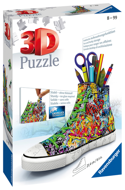Ravensburger Sneaker graffiti - 3D puzzel. * Met 108 stevige kunststof puzzelstukjes ontstaat een sneaker met een cool design van Graffiti, de perfecte decoratie voor je kamer! * Handig: na het puzzelplezier kan de sneaker gebruikt worden als praktische opbergplaats. * Zo kun je alle dingen opbergen die je liever niet laat rondslingeren!