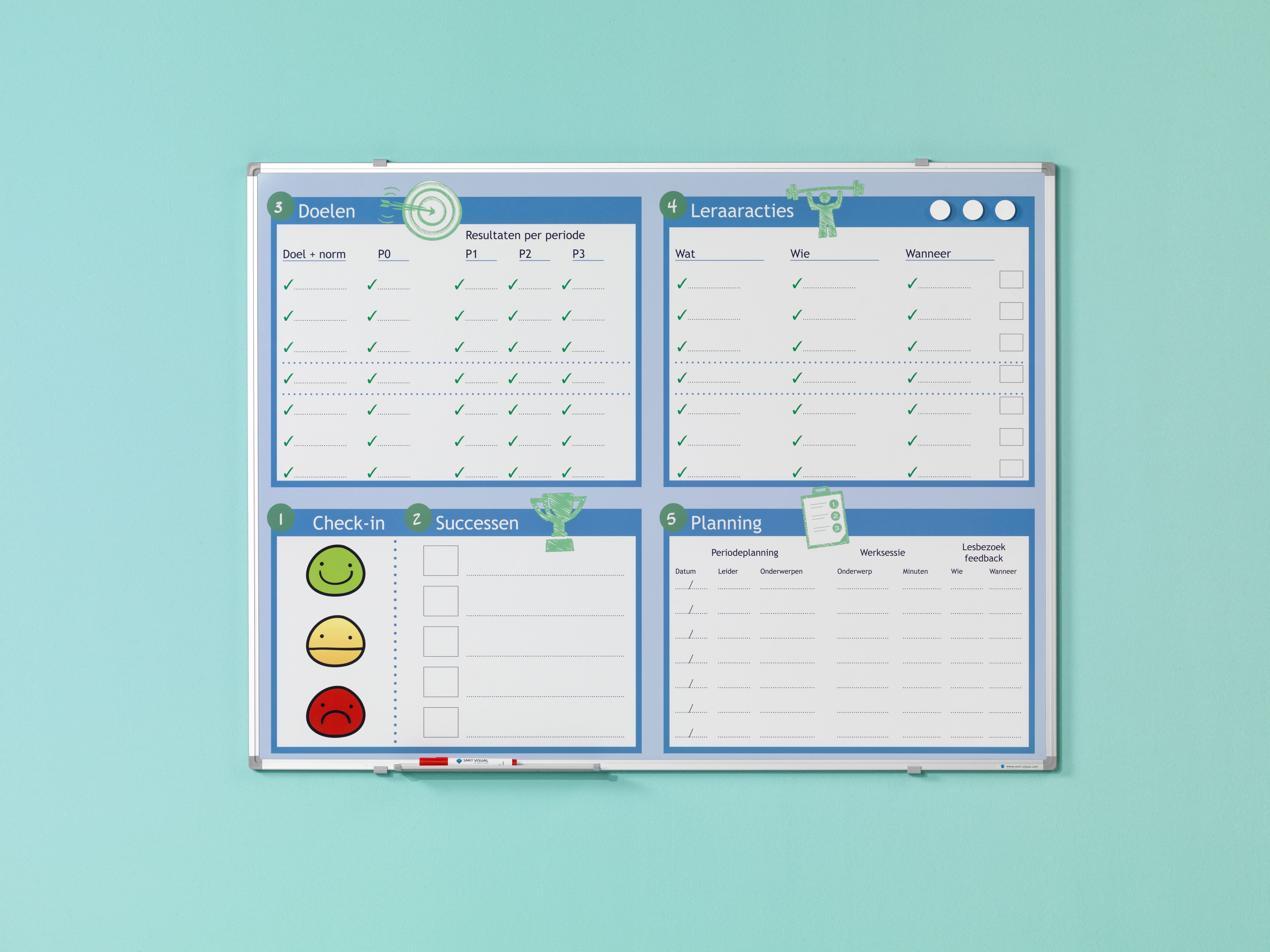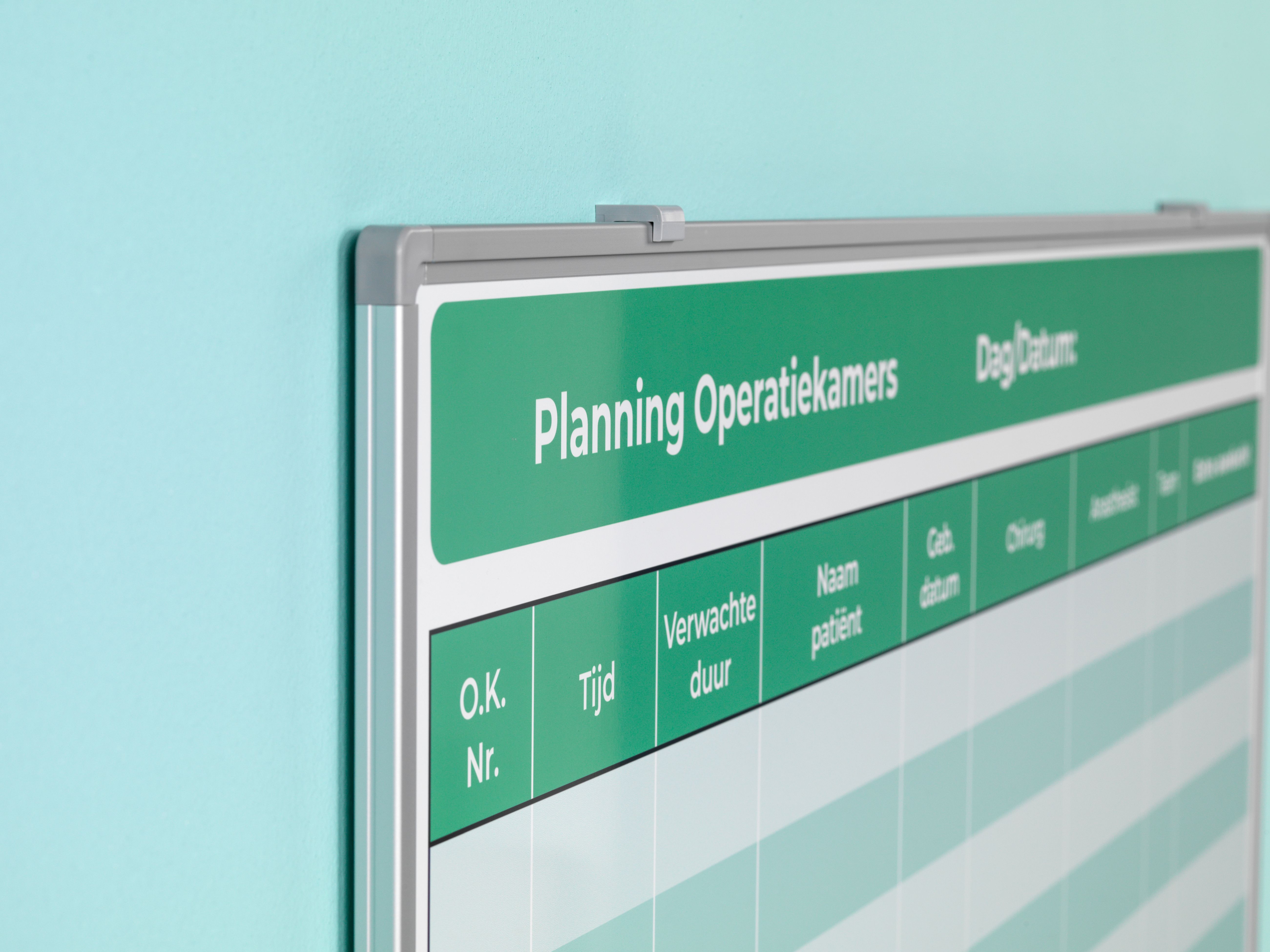 Whitebord met uw eigen full colour bedrukking. Ideaal voor bijvoorbeeld een enkel uniek visual management bord per team of een reeks gepersonaliseerde whiteboards met een bedrijfsontwerp. De borden zijn magneethoudend en droog uitwisbaar. De drukinkt zit in het bord ingebakken en is bestendig tegen krassen. De inkt wordt beschermd tegen zonlicht, zodat de kleuren echt blijven. Het zwart aluminium Softline profiel heeft zwarte kunststof hoeken, zwarte bevestigingshaken en een zwarte afleggoot van 30 cm. Het bord kan met de meegeleverde montageset zowel horizontaal als verticaal gehangen worden. Specificaties: - Afmeting: 90x120 cm - Oppervlak: Sublimatiestaal enkelzijdig beschrijfbaar - Soort bedrukking: Full Colour levendig - 10 jaar garantie op schrijven en wissen - Magneethoudend - Wandmontage horizontaal en verticaal