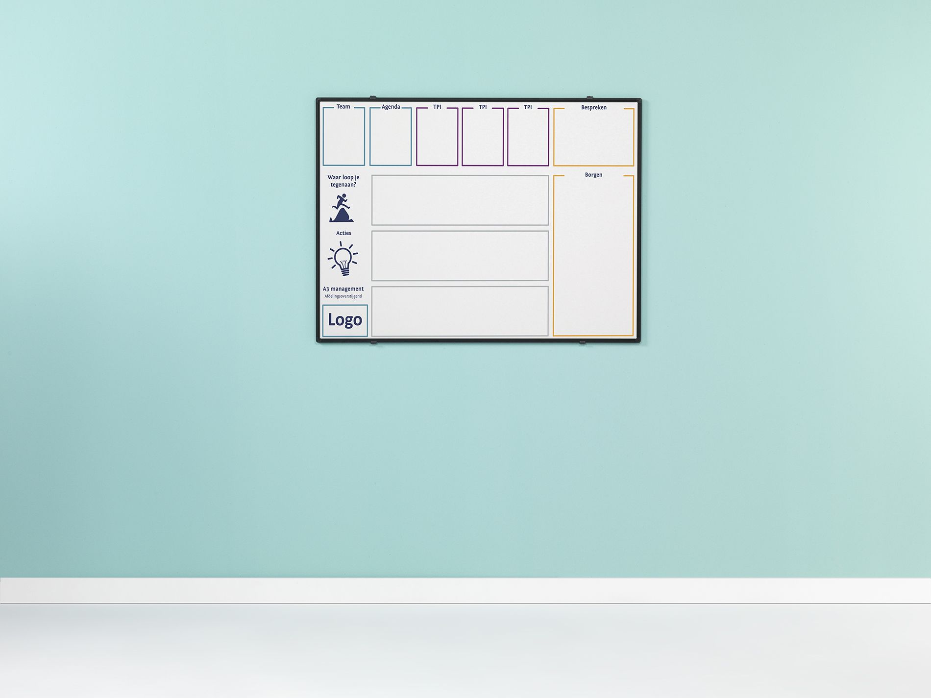 Whitebord met uw eigen full colour bedrukking. Ideaal voor bijvoorbeeld een enkel uniek visual management bord per team of een reeks gepersonaliseerde whiteboards met een bedrijfsontwerp. De borden zijn magneethoudend en droog uitwisbaar. De drukinkt zit in het bord ingebakken en is bestendig tegen krassen. De inkt wordt beschermd tegen zonlicht, zodat de kleuren echt blijven. Het zwart aluminium Softline profiel heeft zwarte kunststof hoeken, zwarte bevestigingshaken en een zwarte afleggoot van 30 cm. Het bord kan met de meegeleverde montageset zowel horizontaal als verticaal gehangen worden. Specificaties: - Afmeting: 120x120 cm - Oppervlak: Sublimatiestaal enkelzijdig beschrijfbaar - Soort bedrukking: Full Colour levendig - 10 jaar garantie op schrijven en wissen - Magneethoudend - Wandmontage horizontaal en verticaal