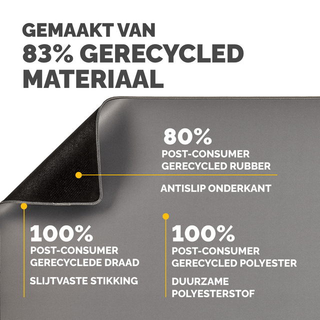 Ruime bureaumat beschermt tegen vuil en krassen en zorgt voor een niet-reflecterend werkoppervlak. Biedt een comfortabel oppervlak om te schrijven en te typen en verbetert de prestaties van de muis. Ingebouwde Microban®-bescherming helpt de groei van bacteriën te voorkomen en werkt 24/7 voor een extra niveau van productbescherming. Gemaakt van 83% gerecycled materiaal. Antislip onderkant houdt de mat de hele dag op zijn plaats. Duurzame platte stiksels voorkomen rafelen. Gemaakt om lang mee te gaan, met 5 jaar garantie.