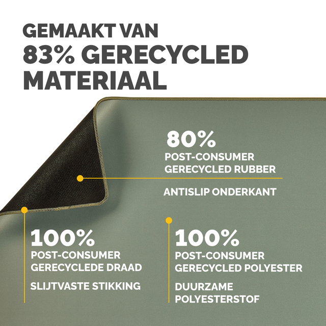 Ruime bureaumat beschermt tegen vuil en krassen en zorgt voor een niet-reflecterend werkoppervlak. Biedt een comfortabel oppervlak om te schrijven en te typen en verbetert de prestaties van de muis. Ingebouwde Microban®-bescherming helpt de groei van bacteriën te voorkomen en werkt 24/7 voor een extra niveau van productbescherming. Gemaakt van 83% gerecycled materiaal. Antislip onderkant houdt de mat de hele dag op zijn plaats. Duurzame platte stiksels voorkomen rafelen. Gemaakt om lang mee te gaan, met 5 jaar garantie.