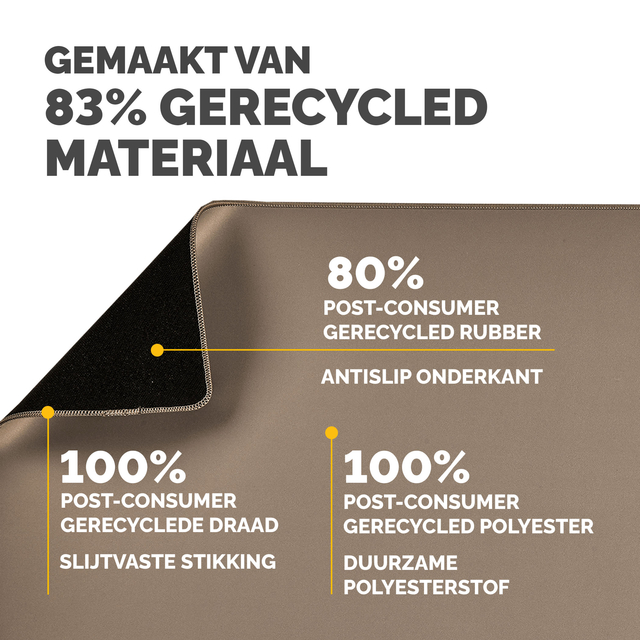 Ruime bureaumat beschermt tegen vuil en krassen en zorgt voor een niet-reflecterend werkoppervlak. Biedt een comfortabel oppervlak om te schrijven en te typen en verbetert de prestaties van de muis. Ingebouwde Microban®-bescherming helpt de groei van bacteriën te voorkomen en werkt 24/7 voor een extra niveau van productbescherming. Gemaakt van 83% gerecycled materiaal. Antislip onderkant houdt de mat de hele dag op zijn plaats. Duurzame platte stiksels voorkomen rafelen. Gemaakt om lang mee te gaan, met 5 jaar garantie.