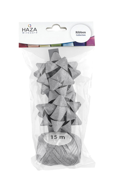 Setje van één polyband eitje, en twee rozetten. Afmeting eitje: 5mmx20m. Afmeting rozetten: 15mm lint, Ø75mm. Kleur: glitter zilver.