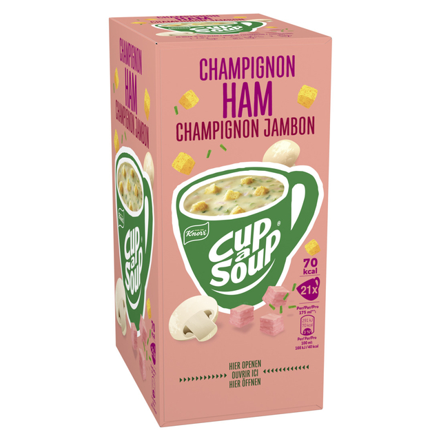 Knorr Cup-a-Soup Champignon Ham . * Bevat 21 zakjes voor 21 heerlijke mokken soep . * 70 calorieën per mok . * Zonder toegevoegde smaakversterkers en kunstmatige kleurstoffen . * Eenvoudig en snel te bereiden . * Een heerlijk tussendoortje .
