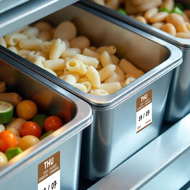 Gekleurde voedsel-dagetiketten zijn essentieel voor efficiënt voorraadbeheer in de horeca. Ze maken het mogelijk om de bereidings- of openingsdatum van voedsel nauwkeurig te volgen. Dankzij een kleurcode per dag identificeert men in één oogopslag de producten die met voorrang gebruikt moeten worden. Dit helpt voedselverspilling te beperken en zorgt voor een optimaal voedselgebruik. Met deze labels voldoet men aan de HACCP-normen en vergemakkelijkt men de controle van de houdbaarheidsdatum. Dankzij de afneembare lijm zijn ze eenvoudig aan te brengen en te verwijderen. Ze kunnen worden gebruikt op alle soorten verpakkingen. In de keuken verbeteren ze de communicatie tussen teams door verwarring over de versheid van de producten te voorkomen. Het gebruik van daglabels betekent dagelijks tijd besparen en tegelijkertijd servicekwaliteit garanderen. Door te investeren in dit efficiënte etiketteringssysteem optimaliseren horeca-eigenaren zowel hun organisatie als hun winstgevendheid.