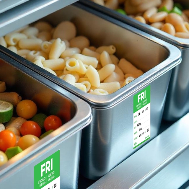 Gekleurde voedsel-dagetiketten zijn essentieel voor efficiënt voorraadbeheer in de horeca. Ze maken het mogelijk om de bereidings- of openingsdatum van voedsel nauwkeurig te volgen. Dankzij een kleurcode per dag identificeert men in één oogopslag de producten die met voorrang gebruikt moeten worden. Dit helpt voedselverspilling te beperken en zorgt voor een optimaal voedselgebruik. Met deze labels voldoet men aan de HACCP-normen en vergemakkelijkt men de controle van de houdbaarheidsdatum. Dankzij de afneembare lijm zijn ze eenvoudig aan te brengen en te verwijderen. Ze kunnen worden gebruikt op alle soorten verpakkingen. In de keuken verbeteren ze de communicatie tussen teams door verwarring over de versheid van de producten te voorkomen. Het gebruik van daglabels betekent dagelijks tijd besparen en tegelijkertijd servicekwaliteit garanderen. Door te investeren in dit efficiënte etiketteringssysteem optimaliseren horeca-eigenaren zowel hun organisatie als hun winstgevendheid.