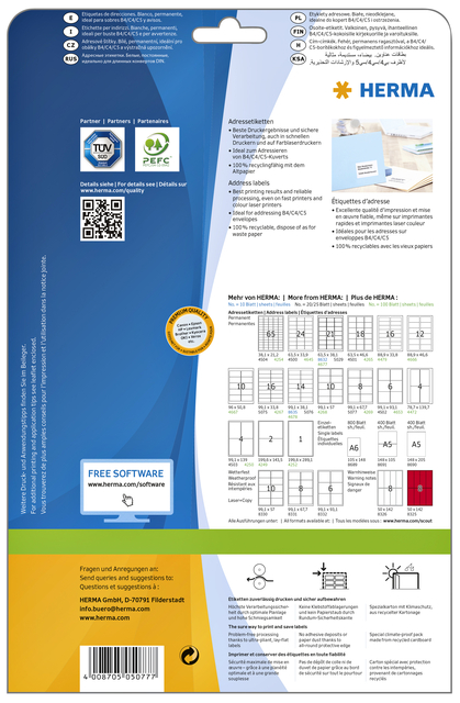 Herma is een toonaangevende fabrikant van zelfklevende etiketten en etiketteersystemen. Het bedrijf is opgericht in 1906 in het Duitse Stuttgart en heeft zich sindsdien ontwikkeld tot een wereldwijde speler op het gebied van labeloplossingen. Het merk staat bekend om zijn hoogwaardige producten en innovatieve oplossingen voor een breed scala aan toepassingen.
