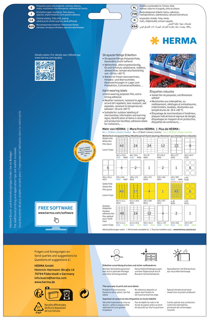 Herma is een toonaangevende fabrikant van zelfklevende etiketten en etiketteersystemen. Het bedrijf is opgericht in 1906 in het Duitse Stuttgart en heeft zich sindsdien ontwikkeld tot een wereldwijde speler op het gebied van labeloplossingen. Het merk staat bekend om zijn hoogwaardige producten en innovatieve oplossingen voor een breed scala aan toepassingen.