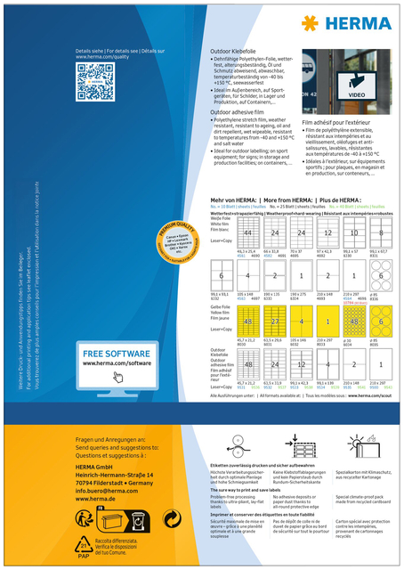 Herma is een toonaangevende fabrikant van zelfklevende etiketten en etiketteersystemen. Het bedrijf is opgericht in 1906 in het Duitse Stuttgart en heeft zich sindsdien ontwikkeld tot een wereldwijde speler op het gebied van labeloplossingen. Het merk staat bekend om zijn hoogwaardige producten en innovatieve oplossingen voor een breed scala aan toepassingen.
