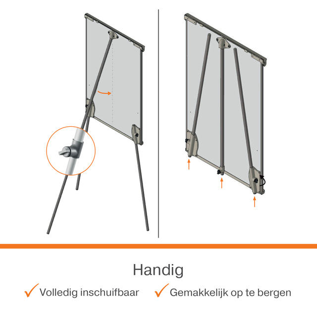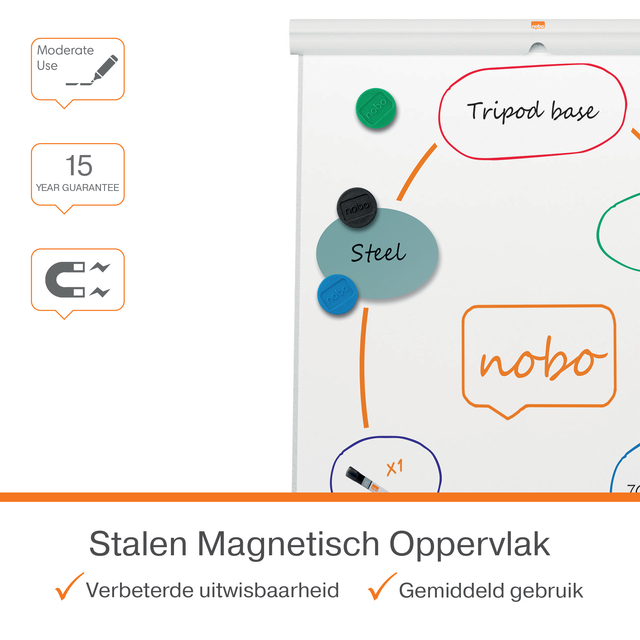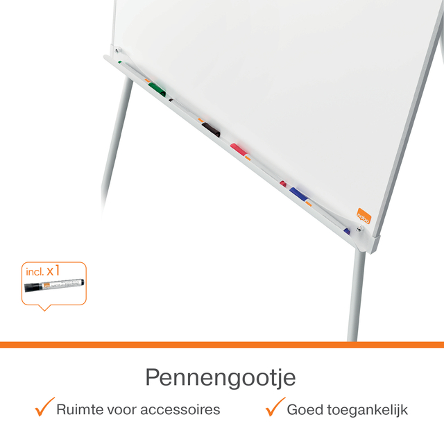 Deze moderne magnetische whiteboard flipover met drie poten en met zijn strakke kunststof afwerking, is de perfecte aanvulling voor elk kantoor of school. Het gelakte stalen oppervlak biedt een betere uitwisbaarheid, is minder gevoelig voor 'ghosting' en bestand tegen krassen en deuken, waardoor het ideaal is voor gemiddeld gebruik. Het gladde oppervlak verbetert het schrijven en zorgt voor duidelijke, opvallende communicatie voor effectieve samenwerking. De flipover heeft in hoogte verstelbare poten en een magnetisch oppervlak, zodat je gemakkelijk notities, foto's en belangrijke informatie kunt bevestigen. Een geïntegreerde pennengoot houdt je whiteboardmarkers en magneten georganiseerd. Uitgerust met flipoverhaken die compatibel zijn met de Nobo flipoverblokken.