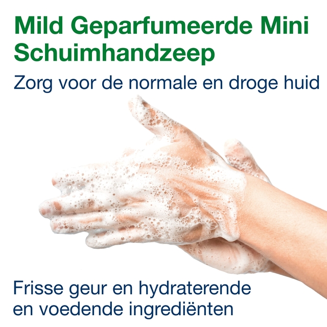 * Verzorgt de normale en droge huid bij dagelijks handen wassen. Tork Milde Schuimzeep heeft een frisse geur en bevat vochtinbrengende, verzorgende ingrediënten. De zeep zorgt voor een rijk en crèmeachtig schuim voor zachte handreiniging. Geschikt voor Tork Mini Zeep en Handdesinfectie Dispensers die gecertificeerd zijn als easy-to-use en aan alle gebruikers goede handhygiëne bieden. * Handzeep met een frisse geur. * Een zachte zeep met hydraterende ingrediënten en een parelmoer glans. * Helpt droge huid voorkomen met ingrediënten die lipiden herstellen. * Dermatologisch getest * 96% van de ingrediënten is van natuurlijke oorsprong. * Minimaliseer energieverbruik. Deze zeep is bewezen effectief met koud water * Huidvriendelijke pH-waarde * Snel vullen in minder dan 10 seconden. * Hygiënisch vullen: in de fabriek verzegelde fles met een nieuwe pomp voor elke vulling helpt het risico op besmetting te verminderen. * Verminder afval: Fles trekt vacuüm, wat leidt tot 70% minder afvalvolume.