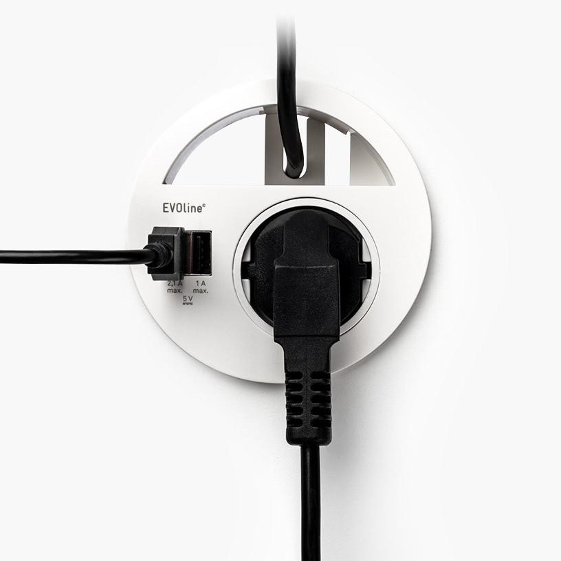 Tafel-inbouwmodule in RAL 9010 zuiver wit met 2 x USB-laadaansluiting (1000 mA), 1 x 230 V stopcontact en kabeldoorvoer met deksel. Selecteer bij het bestellen het model dat overeenkomt met de gewenste installatiepositie. Alleen verkrijgbaar in combinatie met tafels.