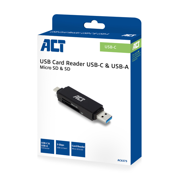 * Kaartlezer voor het overzetten van foto's en bestanden van en naar geheugenkaarten. * USB-aansluitingen: USB USB-C en USB-A. * Ondersteuning voor de meest gebruikte geheugenkaarten: SD/SDHC/SDXC/Micro SD. * Voldoet aan de SuperSpeed USB 3.1 Gen1 (USB 3.0) standaard. * Overdrachtssnelheid tot 5Gbps. * Zet bestanden en foto's over van en naar een geheugenkaart met de AC6375 USB 3.2 Gen1 Kaartlezer. Door het ultra-compacte design neem je de kaartlezer gemakkelijk overal mee naar toe. Haal overdrachtssnelheden tot 5Gbps dankzij SuperSpeed USB 3.2 Gen1. Gebruik de AC6375 op laptops en computers die zijn uitgerust met een USB-C of USB-A poort. * Handig voor onderweg. Door het compacte formaat neem je de AC6375 USB 3.2 Gen1 kaartlezer gemakkelijk overal mee naar toe. De AC6375 heeft ingebouwde USB-connectoren: USB-C en USB-A. Je hoeft dus geen extra kabels te gebruiken. * Ondersteuning voor de meest gangbare geheugenkaarten. De AC6375 Kaartlezer ondersteunt de meest voorkomende types geheugenkaarten waaronder: SD-, SDHC- en SDXC-kaarten. De AC6375 ondersteunt ook Micro SD- en T-FLASH-kaarten. * SuperSpeed USB 3.2 Gen1 (USB 3.0). De ACT AC6375 Kaartlezer maakt gebruik van de USB 3.2 Gen1 (USB 3.0) standaard. Deze standaard zorgt voor een overdrachtssnelheid tot 5Gbps.