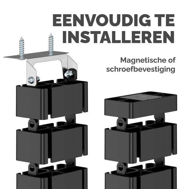 Organiseer en leid kabels moeiteloos van de vloer naar het bureau met deze kabelslang voor een schone, opgeruimde werkplek. Flexibele slang past zich aan aan bureaus (tot 130cm) die in hoogte verstelbaar zijn en beweegt naadloos mee als de bureauhoogte verandert. Vier gescheiden compartimenten houden kabels vrij van wirwar, terwijl de open slang gemakkelijk kabels kan toevoegen of verwijderen. Afneembare onderdelen - 31- in elkaar te klikken delen zodat je de hoogte kunt aanpassen aan je bureau. Verzwaarde voetplaat voor extra stabiliteit. Ingebouwde magneet bevestigt de kabelslang aan de tafelpoot, zodat hij niet in de weg zit. Eenvoudig te installeren met magneet of schroefbevestiging. Gebouwd om lang mee te gaan met 5 jaar garantie.