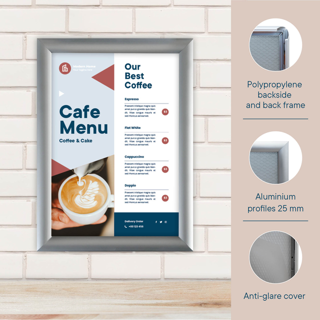 * Ontspiegelde voorzetfolie: De heldere, transparante ontspiegelde voorzetfolie beschermt je poster tegen vuil en vocht, terwijl het zorgt voor een heldere en scherpe weergave van je boodschap.