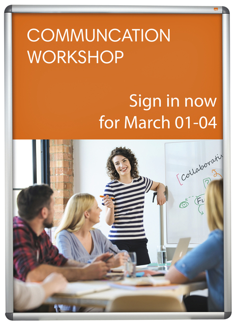 Wandgemonteerd poster frame voor het veilig ophangen van posters, borden en informatie. De handige aluminium clicklijst zorgt voor een professionele afwerking en maakt het mogelijk snel en eenvoudig de inhoud te wisselen. *Producteigenschappen; * Weergave formaat: A0 * Reflectiewerende, polypropyleen afdekplaat ter bescherming van de inhoud * Handige aluminium clicklijst voor eenvoudig wisselen van inhoud * Gladde afgeronde hoeken voor extra veiligheid. * Veilig door hoekbevestiging (inclusief bevestingsmateriaal)