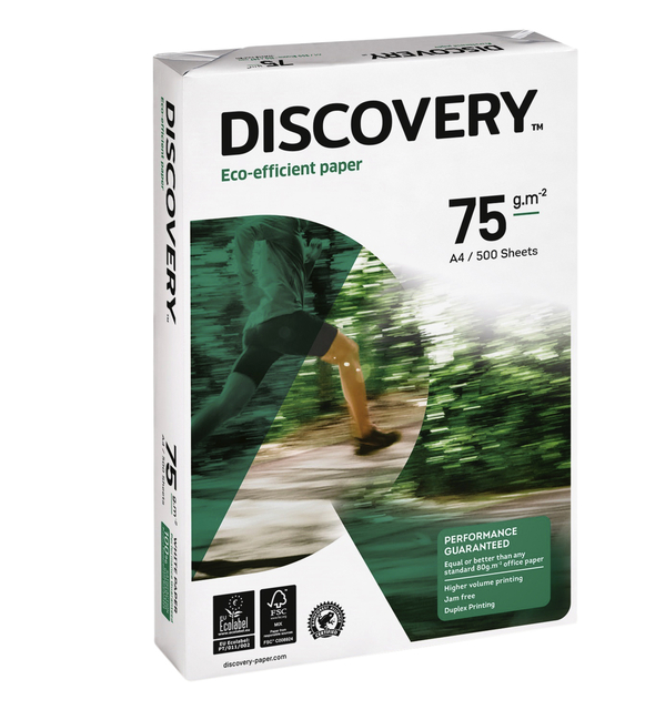 Discovery is een papierlabel dat garant staat voor een zeer eco-effciente productie. Er wordt minder hout gebruikt en de kwaliteit is zeer hoogwaardig. Discovery papier is geschikt voor de meeste moderne kantoormachines. KantoorArtikelen.nl heeft een aantal veel verkochte labels op voorraad en kan deze snel aan je leveren.