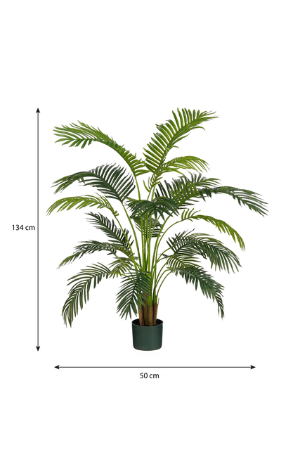 Breng wat onderhoudsvrij groen in huis met deze Arecapalm kunstplant van Mica Decorations! De Palm, ook wel bekend als Goudpalm, staat bekend om de bladeren die een boogvorm hebben en met meerdere stammen die uit één wortelkluit groeien. Hij is gemaakt voor binnen én buiten, want hij is waterproof en UV-resistant. Je kunt hem hierdoor seizoen na seizoen buiten laten staan. Hij heeft een hoogte van ongeveer 140 cm en een diameter van 120 cm en de plant wordt geleverd in een zwarte kunststof pot van hoogte 13 cm met een diameter van 16,5 cm.