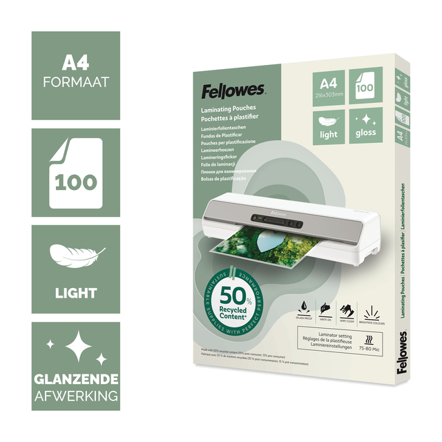 Geef je documenten een nette, professionele uitstraling met deze A4 lamineerhoezen, ontworpen voor dagelijks gebruik en duurzame prestaties. Gemaakt van 50% gerecycled materiaal (minimaal 35% post-consumer, 15% pre-consumer) bieden ze betrouwbare bescherming en ondersteunen ze milieubewuste keuzes. De hoogwaardige glansafwerking zorgt voor veelzijdigheid en visuele aantrekkingskracht, ideaal voor een breed scala aan lamineertaken. Ontworpen voor gebruik op een instelling van 70/80 micron bevat elke hoes een antistatische toevoeging voor soepel en probleemloos gebruik. Verpakt in papiergebaseerde materialen uit duurzame bronnen, inclusief de hoesdrager, tape en buitenverpakking, is deze set van 100 hoezen een slimme keuze voor zowel thuis als op kantoor.