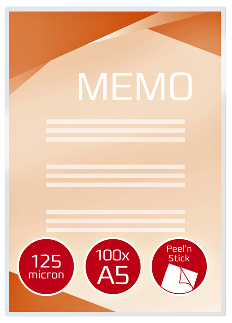 Peel n' Stick-lamineerhoezen zijn ideaal om snel professionele, opvallende borden te maken. De kleeflaag hecht op de meeste materialen, waaronder glas, metaal en karton. U hoeft slechts het schutblad te verwijderen om de lamineerhoes op de gewenste ondergrond te plakken.* Producteigenschappen; * A5-formaat. * Ontwerp kant-en-klare professionele borden. * Glanzende hoezen van 2 x 125 micron. * Aantal stuks per verpakking: 100.