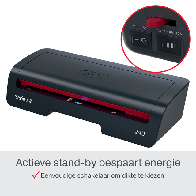 De GBC 240 is een slanke en efficiënte oplossing voor je dagelijkse lamineerbehoeften. Deze A4 lamineermachine is ontworpen met zowel stijl als prestaties in gedachten en is ideaal voor gebruik thuis of op kantoor aan huis. Met een snelle opwarmtijd van 2 minuten lamineert hij een A4 vel van 75 micron in slechts 45 seconden, waardoor hij perfect is voor het efficiënt afhandelen van je thuisprojecten. De gebruiksvriendelijke bedieningsschakelaar biedt drie instellingen voor lamineerhoesdikte van 75-125 micron, wat flexibiliteit biedt voor verschillende soorten documenten. Een anti-vastloop ontgrendelingshendel zorgt voor een soepele werking door het moeiteloos oplossen van verkeerd geplaatste lamineerhoezen. Bovendien vereenvoudigt het SMART status ledsysteem de bediening met duidelijke visuele en auditieve signalen: rood tijdens het opwarmen, blauw met een geluid wanneer de machine klaar is en een automatische uitschakeling na 15 minuten inactiviteit om energie te besparen. Bescherm en bewaar je belangrijke documenten met een perfecte afwerking, elke keer weer. * Snelle opwarmtijd, klaar voor gebruik in slechts 2 minuten. * Compatibel met lamineerhoezen van 75 tot 125 micron. * Lamineert van ID-kaart tot A4 documenten. * Lamineert een A4 document (75 mic) in slechts 45 seconden. Lamineert 13x A4 in 10 minuten. * SMART status led: brandt rood tijdens het opwarmen en wordt blauw met een geluidssignaal wanneer de lamineermachine klaar is voor gebruik. * Met de ontgrendelingshendel is het eenvoudig om een vastzittende lamineerhoes met de hand te verwijderen. * Inclusief een startpakket van 5x A4 lamineerhoezen (75 micron). * Bespaar energie met de automatische uitschakeling na 15 minuten inactiviteit. * Laag geluidsniveau <50Dba voor minder afleiding. * Gebruik voor de beste resultaten GBC documenthoezen. * CE-gecertificeerd, TUV/GS.