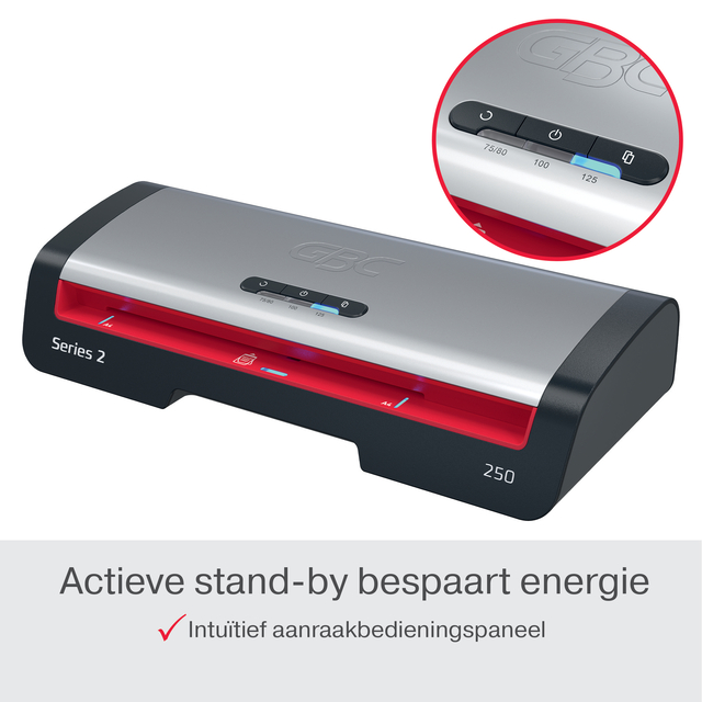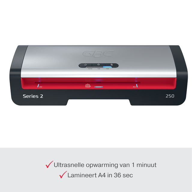 De GBC 250 A4 lamineermachine biedt een betrouwbare en efficiënte oplossing voor je alledaagse lamineerbehoeften. Deze lamineermachine is ontworpen voor professionele omgevingen en combineert prestaties met gebruiksgemak. Met een snelle opwarmtijd van 1 minuut lamineert hij een A4 vel van 75 micron in slechts 36 seconden, waardoor hij ideaal is voor snelle kantoortaken. Het intuïtieve bedieningspaneel biedt drie instellingen voor lamineerhoesdikte van 75 tot 125 micron, wat flexibiliteit biedt voor verschillende soorten documenten. Het paneel heeft ook een anti-vastloop omkeerknop voor probleemloze verwijdering van verkeerd geplaatste lamineerhoezen. Bovendien geeft het SMART status ledsysteem duidelijke visuele en auditieve signalen: rood tijdens het opwarmen, blauw met een geluid wanneer de machine klaar is en een automatische uitschakeling na 15 minuten inactiviteit voor energiebesparing. De SMART invoerleds zorgen voor een rechte uitlijning van de lamineerhoes om vastlopen te voorkomen, waardoor elke laminering perfect is. Bescherm en bewaar je belangrijke documenten met snelheid en telkens weer een gladde, professionele afwerking. * Compatibel met lamineerhoezen van 75 tot 125 micron. * Lamineert van ID-kaart tot A4 documenten. * Lamineert een A4 document (75 mic) in slechts 36 seconden. Lamineert 16x A4 in 10 minuten. * SMART status led: brandt rood tijdens het opwarmen en wordt blauw met een geluidssignaal wanneer de lamineermachine klaar is voor gebruik. * SMART invoerleds: zorgen ervoor dat de lamineerhoezen recht door de lamineermachine worden gevoerd om vastlopen te voorkomen. * Het bedieningspaneel heeft een anti-vastloop omkeerknop voor het eenvoudig verwijderen van verkeerd ingevoerde lamineerhoezen. * Inclusief een startpakket van 5x A4 lamineerhoezen (75 micron). * Bespaar energie met de automatische uitschakeling na 15 minuten inactiviteit. * Laag geluidsniveau <50Dba voor minder afleiding. * Gebruik voor de beste resultaten GBC documenthoezen. * CE-gecertificeerd, TUV/GS.