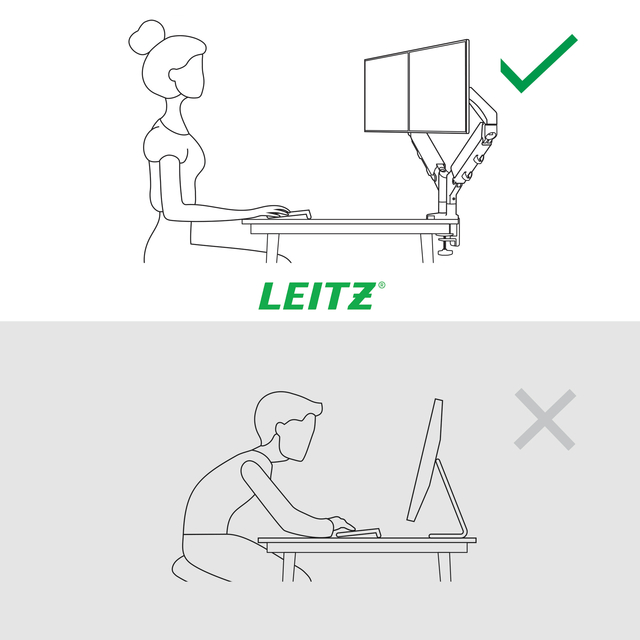De Leitz TÜV en IGR gecertificeerde ruimtebesparende Dubbele Monitorarm heeft een positieve invloed op de lichaamshouding, bevordert een goede ooglijn en ondersteunt het comfort van nek en schouders als de hoogte van de monitoren correct en zoals aanbevolen is ingesteld op de ideale ergonomische positie. De monitorstandaard blijft stabiel op alle hoogtes en hoeken en kan eenvoudig worden gewisseld tussen liggende en staande positie. Het ontwerp is ideaal wanneer de ruimte beperkt is en het zal kostbare ruimte op het bureau vrijmaken dankzij de uiterst veelzijdige armen die je moeiteloos vlak kunt plaatsen, kantelen en in elke richting kunt bewegen met slechts één hand. Ergonomisch ontworpen om het welzijn te bevorderen en de productiviteit te verhogen.