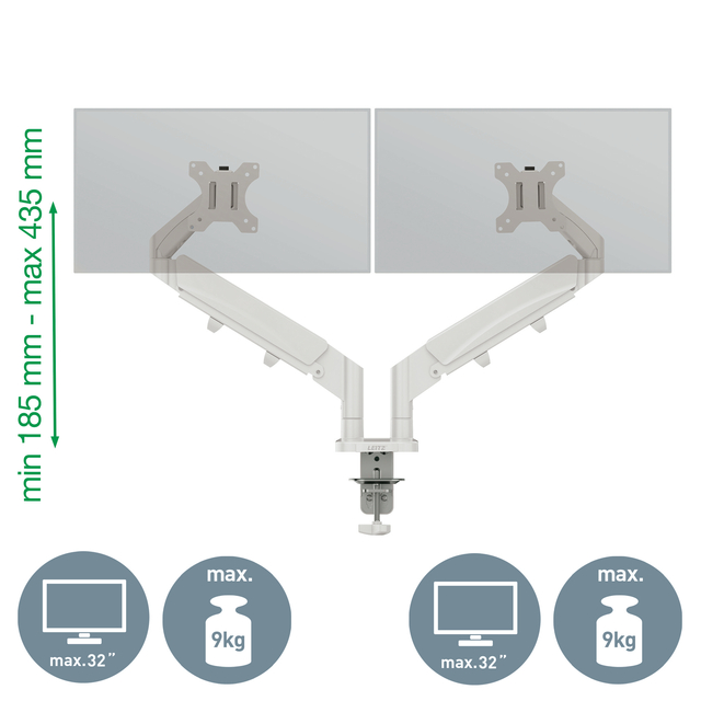 * Dubbele armen met veerondersteuning om de hoogte van de monitor gemakkelijk aan te passen (185mm-435mm).