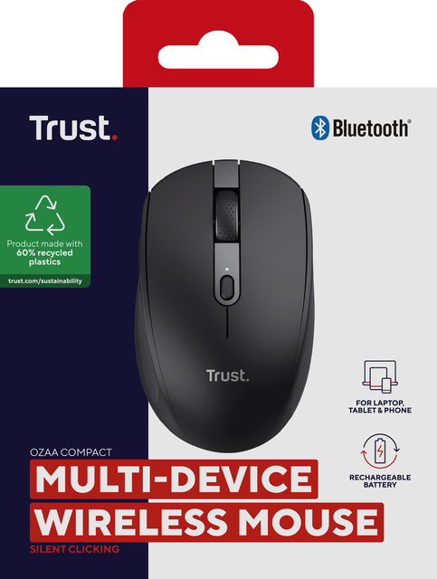 * Snel wisselen tussen meerdere apparaten? De Ozaa compact draadloze Muis is precies daarvoor gemaakt. * Verbind tot drie apparaten tegelijkertijd dankzij de draadloze verbinding via USB 2.4GHz receiver of werk op twee apparaten tegelijk via Bluetooth. * Lawaai op kantoor is voor niemand fijn. Daarom hebben we de Ozaa compact stille knoppen gegeven, zodat jij productief kunt werken zonder iemand in je omgeving te storen. * Je voorraad batterijen kun je weer opbergen. Met zijn oplaadbare batterij is de Ozaa namelijk altijd klaar om aan de slag te gaan. * Jij kunt urenlang de muis gebruiken en ook gewoon door blijven werken terwijl je oplaadt via de inbegrepen oplaadkabel. * Wat je ook zoekt in een muis, de Ozaa Compact heeft het in huis. * Het compacte formaat past makkelijk in je hand en de twee zijknoppen en optische sensor tot 3200 DPI maken werken makkelijk. * Verder bestaat het design voor 60% uit gerecycled plastic, zodat je dat alles ook nog eens duurzaam kunt doen.