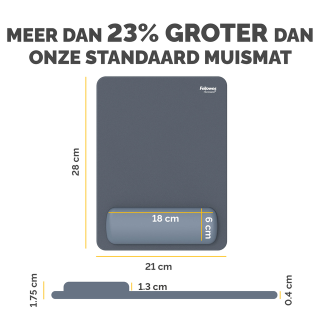 23% groter dan onze standaard muismat-polssteun om meer beweging te stimuleren en kleine, herhaalde bewegingen te verminderen die pijn in de pols kunnen veroorzaken. De HEX Cushion Technology™ (octrooi aangevraagd) combineert gelijkmatige ondersteuning met superieur comfort tijdens het muisgebruik. De zacht aanvoelende, stofwerende polssteun heeft een hoogwaardige afwerking en zorgt voor een soepele muiservaring. De ingebouwde Microban®-bescherming helpt de groei van bacteriën te voorkomen en werkt 24/7 voor extra productbescherming. Bescherm je bureau en verbeter de prestaties van je muis met deze muismat die geschikt is voor optische en lasermuizen. Gemaakt van 74% gerecycled materiaal en 100% recyclebaar met het terugnameprogramma van Fellowes. Gemaakt om lang mee te gaan met 5 jaar beperkte garantie. Getest door FIRA International Ltd om te voldoen aan de ergonomische eisen van de Europese gezondheids- en veiligheidswetgeving: EN ISO 9241-5.