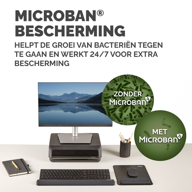 23% groter dan onze standaard muismat-polssteun om meer beweging te stimuleren en kleine, herhaalde bewegingen te verminderen die pijn in de pols kunnen veroorzaken. De HEX Cushion Technology™ (octrooi aangevraagd) combineert gelijkmatige ondersteuning met superieur comfort tijdens het muisgebruik. De zacht aanvoelende, stofwerende polssteun heeft een hoogwaardige afwerking en zorgt voor een soepele muiservaring. De ingebouwde Microban®-bescherming helpt de groei van bacteriën te voorkomen en werkt 24/7 voor extra productbescherming. Bescherm je bureau en verbeter de prestaties van je muis met deze muismat die geschikt is voor optische en lasermuizen. Gemaakt van 74% gerecycled materiaal en 100% recyclebaar met het terugnameprogramma van Fellowes. Gemaakt om lang mee te gaan met 5 jaar beperkte garantie. Getest door FIRA International Ltd om te voldoen aan de ergonomische eisen van de Europese gezondheids- en veiligheidswetgeving: EN ISO 9241-5.