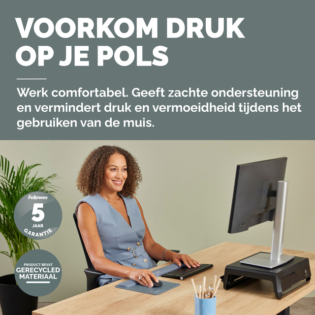 De HEX Cushion Technology™, waarvoor patent is aangevraagd, zorgt voor een gelijkmatige ondersteuning en supercomfort tijdens het muisgebruik. De zachte, stofwerende polssteun heeft een mooie afwerking en zorgt voor een soepele muiservaring. De ingebouwde Microban®-bescherming helpt de groei van bacteriën tegen te gaan en werkt 24/7 voor extra bescherming van het product. Bescherm je bureau en verbeter de prestaties van je muis met deze muismat die geschikt is voor optische en lasermuizen. Gemaakt van 69% gerecycled materiaal en 100% recyclebaar met het terugnameprogramma van Fellowes. Gemaakt om lang mee te gaan met 5 jaar beperkte garantie. Getest door FIRA International Ltd om te voldoen aan de ergonomische eisen van de Europese gezondheids- en veiligheidswetgeving: EN ISO 9241-5.