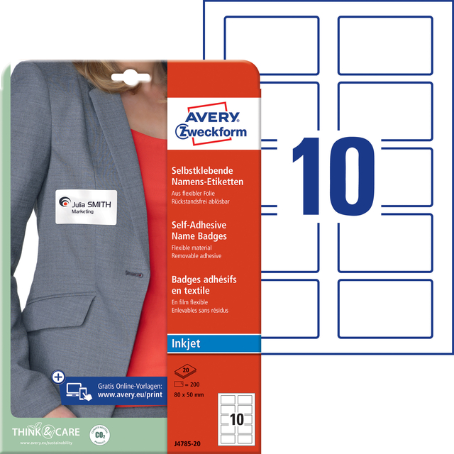 Eigenschappen "Naambadge etiket Avery Zweckform J4785-20 80x50mm wit 200 etiketten"