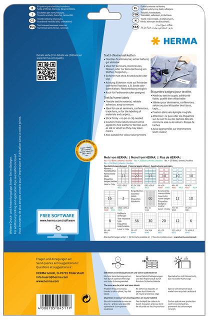 Herma biedt een breed assortiment van zelfklevende etiketten en etiketteersystemen aan voor verschillende toepassingen. Het assortiment omvat onder andere adresetiketten, barcodelabels, productetiketten, verzendetiketten en etiketten voor industriële toepassingen. Daarnaast biedt Herma ook speciale etiketten aan voor bijvoorbeeld de voedingsmiddelenindustrie en de farmaceutische industrie. Het bedrijf streeft naar duurzaamheid en biedt daarom ook milieuvriendelijke opties aan, zoals recyclebare etiketten en etiketten van gerecycled papier.
