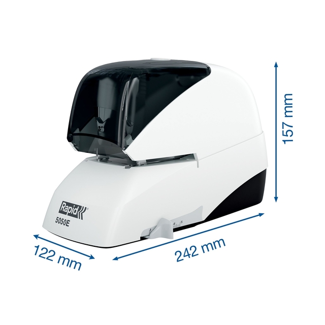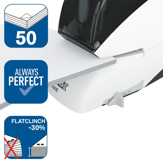 * De 5050E nietmachine voor moeiteloos nieten. Gepatenteerde cassette niettechnologie niet 5.000 keer zonder herladen en ongeacht aantal vel papier. Ontworpen voor 500.000 niethandelingen. * Producteigenschappen; * Capaciteit tot 50 vel papier (80 g/m²). * Slijtage gevoelige onderdelen worden vervangen met elke nieuwe cassette. *Instelbare inlegdiepte tot 50 mm. * Indicator bij lage voorraad nietjesmagazijn. * Makkelijk te laden. * Zeer stille machine en lage vibratie. * Één cassette (5.000 nietjes) meegeleverd. * Werktafel en pedaal optioneel verkrijgbaar. * Hygiënisch nieten door contactloos gebruik. Je hoeft de machine niet aan te raken.