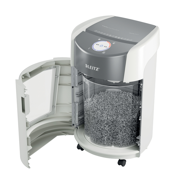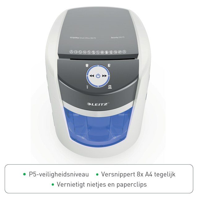 De Leitz IQ OptiMax papiervernietiger voor kleine kantoren biedt een innovatieve, stijlvolle oplossing die is ontworpen om uitzonderlijke documentbeveiliging en gemoedsrust te bieden. * Versnippert tot 8x vellen A4-papier (80 gsm) in slechts 8 seconden, in zeer veilige P5 microsnippers. * De unieke Bin Rotation Technology (BRT) maximaliseert de capaciteit van de opvangbak met +33%* en vermindert aanzienlijk de rommel bij het legen.*Leitz IQ OptiMax 350 getest met en zonder bin rotation technology * De ruime opvangbak van 22 liter kan tot 350 x A4-vellen bevatten voordat hij geleegd moet worden; +33% meer capaciteit vergeleken met geen BRT (+90 x A4-vellen). * Intuïtief LED-display met waarschuwingsaanduidingen voor volle opvangbak, deur open, oververhitting en overbelasting. * Ultrastille werking - voor een rustige werkomgeving (bij regelmatig gebruik van Leitz olievellen) * Versnippert moeiteloos nietjes en paperclips, je hoeft ze niet eerst te verwijderen. * Continue werktijd van 20 minuten, perfect voor kantoorgebruik. * Anti-vastlooptechnologie betekent dat de papiervernietiger automatisch stopt en het papier terugdraait als er te veel papier wordt ingevoerd. * Het ruimtebesparende ronde ontwerp past netjes in hoeken en krappe ruimtes om je kantoorruimte te maximaliseren. * Gemakkelijk te verplaatsen naar verschillende locaties dankzij vier zwenkwielen van hoge kwaliteit.
