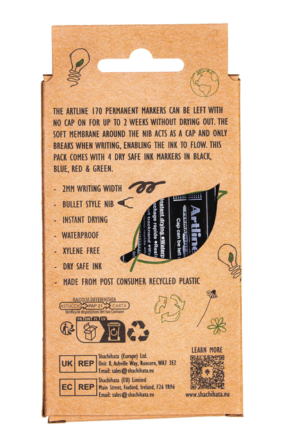 Ecologische Permanent Markers gemaakt uit 65.6% gerecycled materiaal met Dry-Safe inkt die 2 weken zonder dop kunnen blijven zonder uit te drogen. Konische punt 2mm. Kleur : zwart – rood – blauw – groen. Verpakt in Kraft doosje. Gecertifieerd door Eco Mark-label. Post consumer recycled plastic.