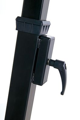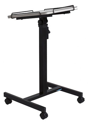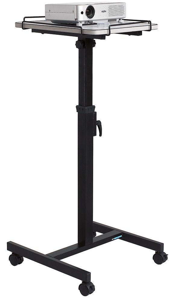 Verrijdbare projectortafel uit zwart gepoederlakt staal met een neigbaar (0- 15º) lichtgrijs werkblad, voorzien van een antisliplaag en opstaande rand. Voorzien van vier stevige wielen (twee met rem). Traploos in hoogte instelbaar.