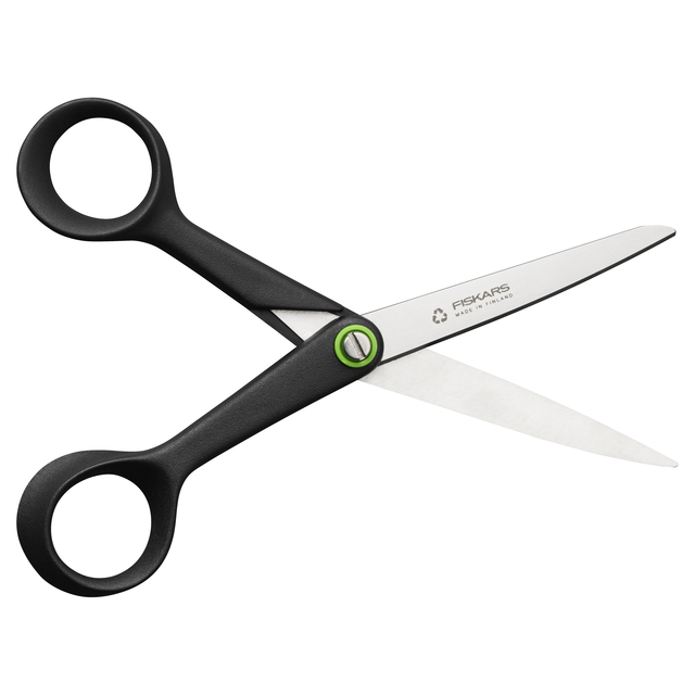 * De Fiskars Functional Form ReNew kleine universele schaar biedt duurzaam vakmanschap en uitzonderlijk comfort voor alledaagse knipbehoeften. * Gemaakt van minimaal 70% gerecycled materiaal en geproduceerd in onze milieugecertificeerde fabriek in Finland, staat deze schaar voor kwaliteit en milieubewustzijn. * Elke schaar wordt met de hand afgewerkt en streng getest om optimale prestaties te garanderen. * De compacte vorm is ideaal voor tal van dagelijkse taken in en rondom het huis. * De precisiegeslepen bladen, gemaakt van ongeveer 80% gerecycled roestvrij staal, blijven langdurig scherp. Het ergonomische handvat, gemaakt van gerecycled plastic (80%) en glasvezel (20%), biedt een comfortabele en stevige grip, perfect voor langdurig gebruik. *Met zijn zero-plastic verpakking die makkelijk recyclebaar is en vaatwasbestendige eigenschappen, is deze schaar zowel praktisch als milieuvriendelijk. * Met een lengte van 17 cm is de Fiskars ReNew schaar speciaal ontworpen voor links en rechtshandigen en levert langdurige prestaties met aandacht voor het milieu.