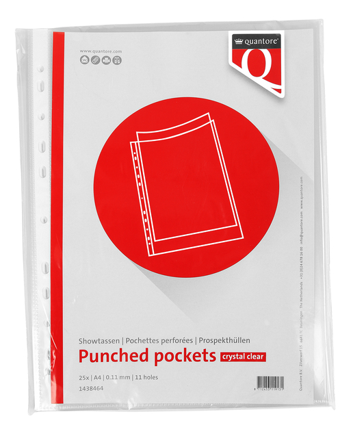 De Quantore Showtas A4 met een extra stevige dikte van 0,11mm is jouw betrouwbare partner voor het professioneel presenteren en langdurig bewaren van documenten. Deze gladde showtas is vervaardigd uit hoogwaardig polypropyleen en biedt optimale bescherming tegen vouwen, vuil en verkleuring. Dankzij de copysafe-eigenschap blijven afdrukken perfect intact, zelfs bij langdurig gebruik. Je documenten schuif je snel en eenvoudig in via de open bovenzijde. De 11 versterkte ponsgaten zorgen ervoor dat je de tas in elke standaard map, ordner of ringband kunt opbergen. Praktisch, duurzaam en onmisbaar op elk bureau of in elke schooltas.