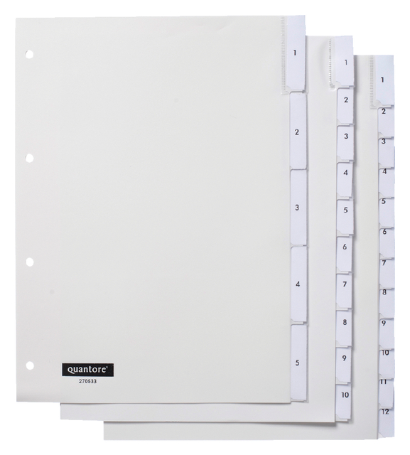 De Quantore tabbladen 4-gaats 10-delig met venster wit bieden je maximale flexibiliteit én een verzorgde uitstraling in je ordner. Deze ivoorkleurige tabbladen van stevig polypropyleen zijn perfect geschikt voor intensief gebruik, zowel thuis als op kantoor. De tabs zijn voorzien van opgelaste transparante vensters, waarin je eenvoudig verwisselbare tekststrookjes kunt plaatsen – zo bepaal je zelf de indeling en pas je deze moeiteloos aan. Dankzij de 4-gaats perforatie passen ze in elke standaard ringband. Een praktische en duurzame oplossing voor wie houdt van overzicht en aanpasbaarheid. Kenmerken: * Type: 4-gaats 10-delig met venster. * Materiaal: ivoorkleurige kunststof van polypropyleen. * Dikte: 0,12mm. * Vensters: opgelaste transparante vensters. * Verpakking: per set in krimpfolie.