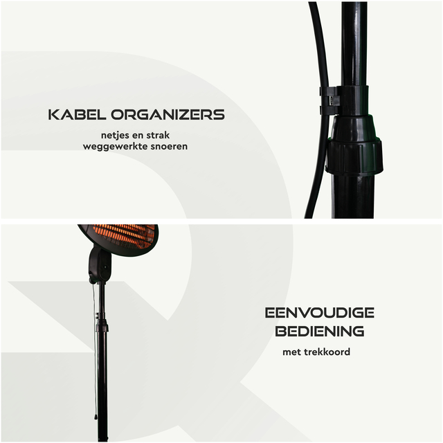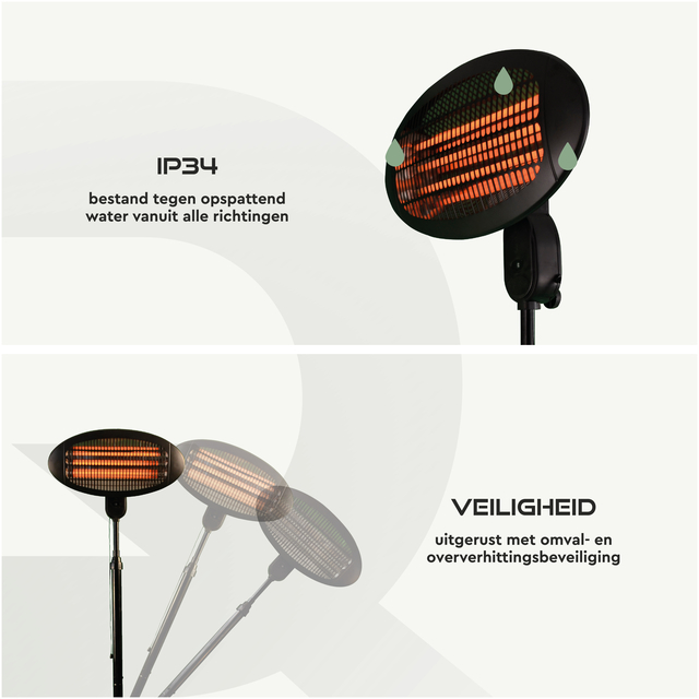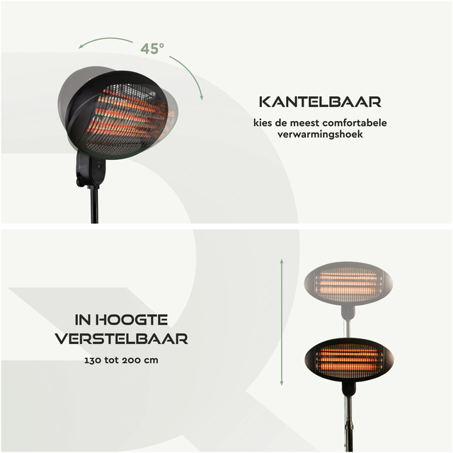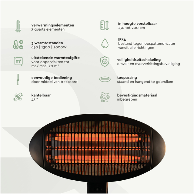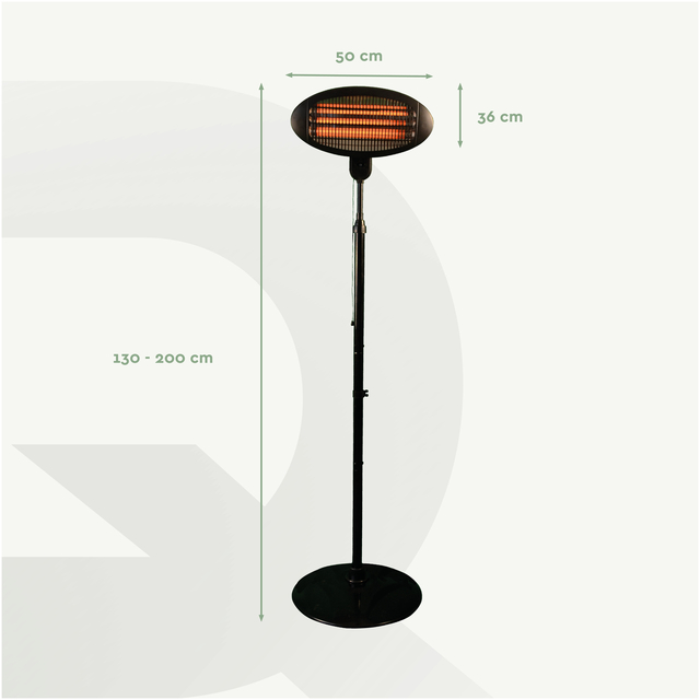 * Wat is er nou lekkerder dan op een frisse avond toch nog even wat langer buiten te blijven zitten? Met het assortiment BRASQ Terrasverwarmers geniet je, ook tijdens de wat koudere dagen of frisse avonden, van aangename temperaturen. De verwarmer is te gebruiken voor privé of commercieel gebruik, zoals in de horeca op buitenterrassen, in achtertuinen, garages en op de camping. Verleng direct het buitenseizoen en geniet in eigen tuin, patio of onder je overkapping van sfeervolle avonden in elk seizoen! Deze design terrasverwarmer biedt gezelligheid en functionaliteit. De warme en rode gloed voegt een sfeervol element toe aan elke (semi-)buitenruimte. Doordat de behuizing IP34 spatwaterdicht is, is hij ook bruikbaar op de camping in de tent of tijdens de zomerbarbeque in de partytent. * De lamp heeft een afmeting van 50x36 cm en is uitgerust met 3 quartz verwarmingselementen. Deze buizen warmen direct op en zorgen voor een sfeervolle en aangename verlichting. Door middel van een trekkoord verwarm je met gemak en snelheid een ruimte tot 20m2. Met drie warmtestanden, die je regelt door middel van het trekkoord, van 650/1300/2000 watt kies je zelf hoe warm het wordt. * Heb je een receptie waarbij de gasten staan, of zit je comfortabel in je loungestoel? Deze terrasverwarmer is in hoogte verstelbaar en kan van 130 tot 200 cm verhoogd worden. De stabiele verzwaarde paal en voet zijn van staal, en met een voet van Ø60cm staat hij stevig op zijn plaats. * De terrasverwarmer heeft een automatische veiligheidsuitschakeling die de hem automatisch uitschakelt als het apparaat toch omvalt in een hoek van minimaal 180, of wanneer deze oververhit raakt. Voor extra veiligheid is het verwarmingselement afgeschermd met een rooster, zodat de lampen niet per ongeluk aangeraakt kunnen worden. De terrasverwarmer wordt geleverd inclusief bevestigingsmaterialen. Voor alle liefhebbers van het buitenleven biedt de BRASQ Terrasverwarmer een war(m)e uitkomst. * Afmetingen: 210 cm hoog totaal – 50x36 cm lamp * Afmeting paal: Ø38mm * Gewicht: 8.4 kg * Materiaal: Staal (met keramische hittebestendige verf) * Voeding: Netstroom * Hoogte: in hoogte verstelbaar 130-200cm * Wattage: 650/1300/2000W * IP waarde: IP34 spatwaterdicht * Verwarmingselement: 3 quartz buizen * Afstandsbediening: Nee * Beschermingsklasse: 1 * Keurmerken: TUV-GS gecertificeerd * Gebruiksaanwijzing: Ja * Bevestigingsmateriaal: Ja, inbegrepen * Garantie: 1 jaar