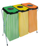 EKOTHINKS 3 Drievoudige afvalzakhouder bestaande uit een opvouwbaar frame van gegalvaniseerd staal en gekleurd kunststof deksel. Deksel heeft een ronde opening met drukklep. Kleur: groen geel oranje Formaat: B 960 mm L 420 mm H 820 mm