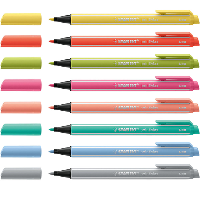 * De STABILO pointMax is een innovatieve fineliner met een zeer intense kleur en geurloze ink op waterbasis. * Door de unieke robuuste punt is deze pen geschikt om mee te schrijven en fijne lijnen te tekenen. * De nylon punt zorgt voor een prettig schrijfgevoel, zelfs bij intensief gebruikt. * De pen kan 24 uur zonder dop zonder uit te drogen. * Geventileerde dop die op het uit uiteinde van de pen kan worden geplaatst met handige clip. * De lijndikte van de fineliner is 0,8 mm.