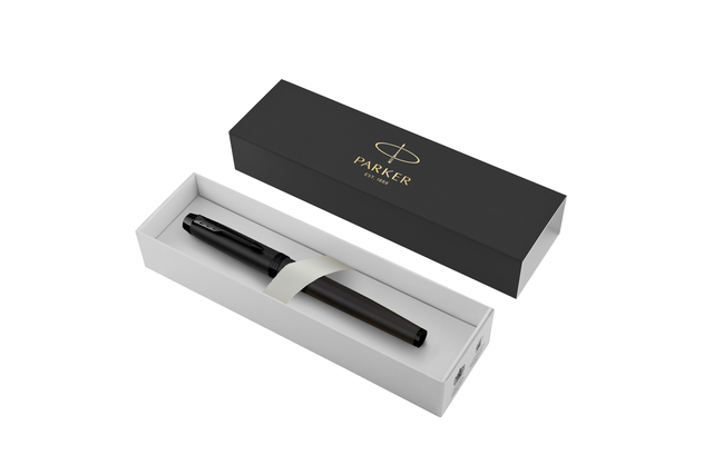 * De nieuwe Parker IM Achromatic Collectie is het toonbeeld van een ingetogen, functionele stijl en laat van zich horen, zonder schreeuwerig te zijn. * Maak een blijvende eerste indruk met de volledig zwarte uitvoering die een opvallende stealth-esthetiek projecteert. * De collectie is gemaakt volgens de hoge standaard die symbolisch is voor Parker's expertise en vakmanschap en introduceert tevens een primeur voor het IM-aanbod. * De kenmerkende pijlclip, details en penpunt zijn afgewerkt met een geavanceerde zwarte PVD-coating die een unieke slijtvastheid en roestbestendigheid heeft en de achromatische esthetiek verrijkt. * De nieuwe Parker IM Achromatic Collectie. * Stijl hoeft niet schreeuwerig te zijn. * Inclusief vulling blauw.