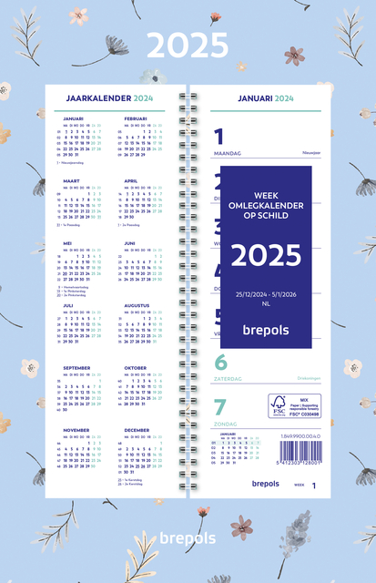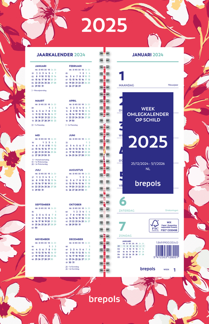 Eigenschappen "Weekkalender 2026 Brepols 190x130 7dagen/1pagina spiraal Fantasie assorti"