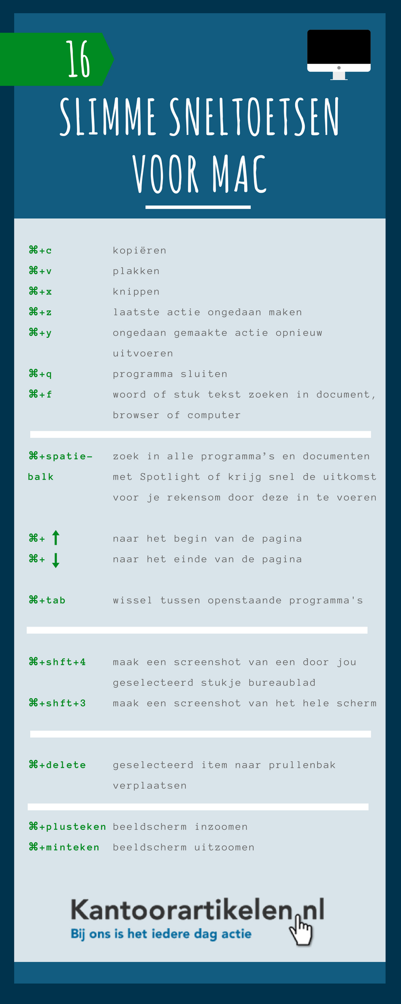 En zo zijn er dus nog veel en veel meer slimme sneltoetsen die je computerleven een stuk eenvoudiger en sneller maken. Het zijn er teveel om ze allemaal voor je op te sommen. Daarom beperken wij ons hier tot de meest gebruikte sneltoetsen voor Windows en Mac. En we hebben er meteen twee handige plaatjes van gemaakt, die je kunt printen en in het begin naast je computer kunt leggen om erin te komen. Maar je zult zien; als je ze maar vaak genoeg gebruikt, dan ken je ze in no time uit je hoofd. Net zoals copy, paste er inmiddels bij iedereen wel ingebakken zit…