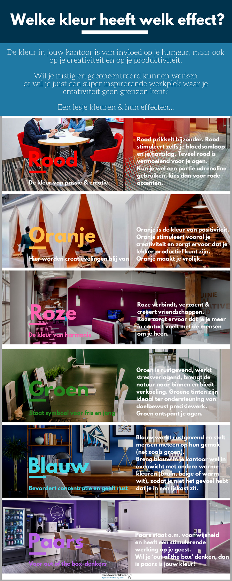 Kleuren hebben dan invloed op hoe jij je voelt op kantoor. Op je humeur. Want kleuren roepen associaties op.