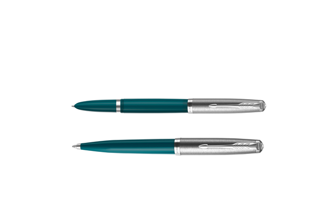 * De Parker 51 is tegenwoordig net zo baanbrekend als toen hij voor het eerst werd gelanceerd in 1941. * Dit unieke schrijfinstrument is geïnspireerd op de pen die ooit werd gezien als 'de meest gewilde' ter wereld. * Het heeft zijn kenmerkende gestroomlijnde vorm en iconische bedekte penpunt behouden, maar is gemaakt voor de toekomst. * De balpen van Parker 51 in groenblauw met een chroom afwerking heeft een gestroomlijnde vorm en een iconische bedekte penpunt met roestvrij staal.* Hij is met de hand geassembleerd met mooi groenblauw hars, afgewerkt met een roestvrijstalen dop, palladium juweel en details op de dop.* Deze balpen profiteert van de expertise en reputatie voor superieur vakmanschap van Parker. * De aandacht voor detail is ongeëvenaard, van concept tot assemblage. Er wordt een giftbox meegeleverd..