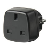Adapter waarmee elektrische apparatuur met behulp van het Britse stekker-systeem te gebruiken is in landen met een geaardstopcontact, bijv DE, FR, BE, PL, NL, ES, PT, SE, FI, NO, GR, TR, AT